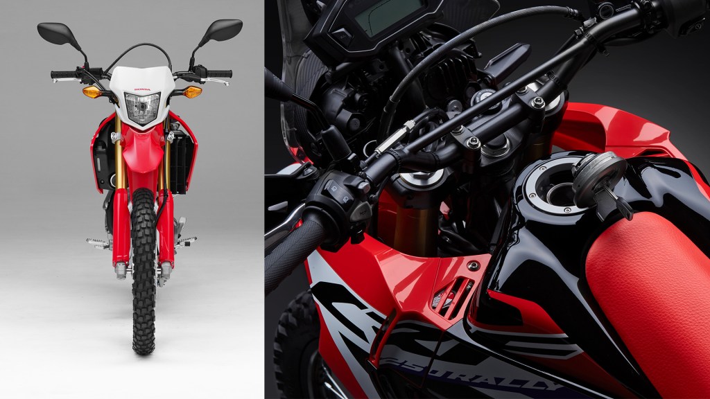 The CRF250L comes finished in Honda’s Extreme Red racing colour as a base, with black and white accents drawn directly from HRC’s factory machines.