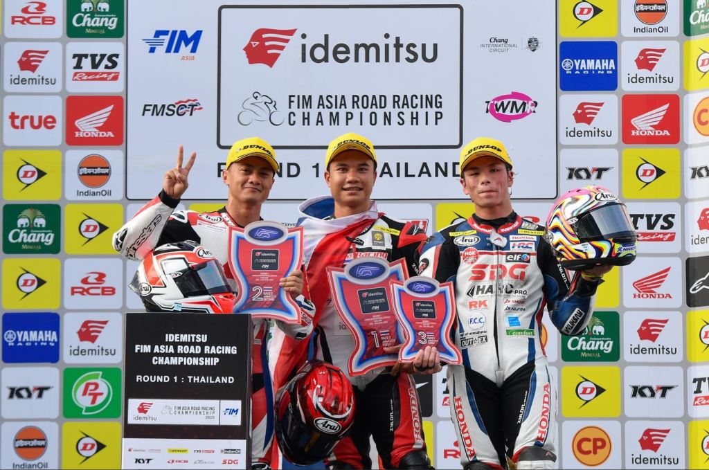 HONDA RACING THAILAND‘s Nakarin Atiratphuvapat proudly waved the Thai flag on the ASB1000 podium as he celebrated his double win in the opening round of the 2025 IDEMITSU FIM Asia Road Racing Championship in front of his home crowd.